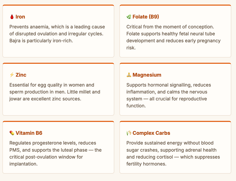 Here are the five fertility-critical nutrients millets provide, and exactly what each one does for your reproductive health: